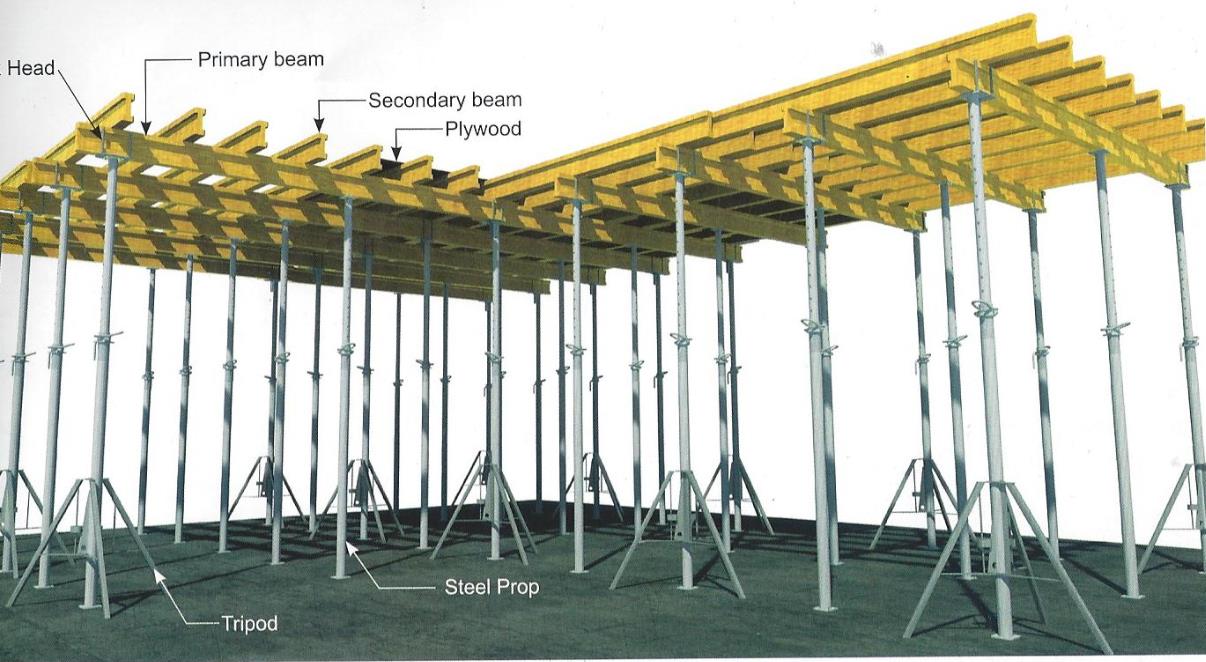 القوالب المرنة عبارة عن نظام معياري يتكون من عوارض أولية وثانوية مصنوعة من عوارض خشبية H20 ودعائم فولاذية وحوامل ثلاثية القوائم وموصلات زاوية ورؤوس.تم تصميم العوارض الخشبية بحيث يمكن تجميعها وتفكيكها بسهولة، كما أنها محمية بمصد بلاستيكي لضمان عمر افتراضي طويل.توفر الدعامات الفولاذية والحوامل الثلاثية الدعم للنظام وتسمح بتعديل ارتفاع القوالب المرنة.تُستخدم الرؤوس لدعم العوارض الأولية ويتم ربطها بالدعائم الفولاذية.يتم توصيل الحزم الأولية والثانوية بواسطة موصلات زاوية.